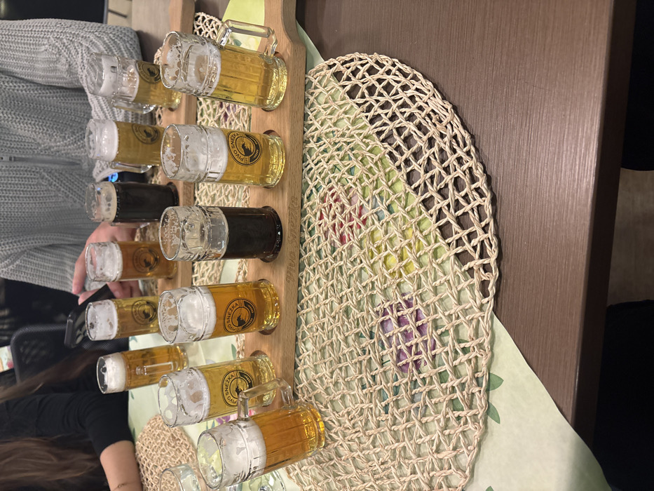A collection of small beer mugs, some filled with dark beer, arranged on a wooden tray