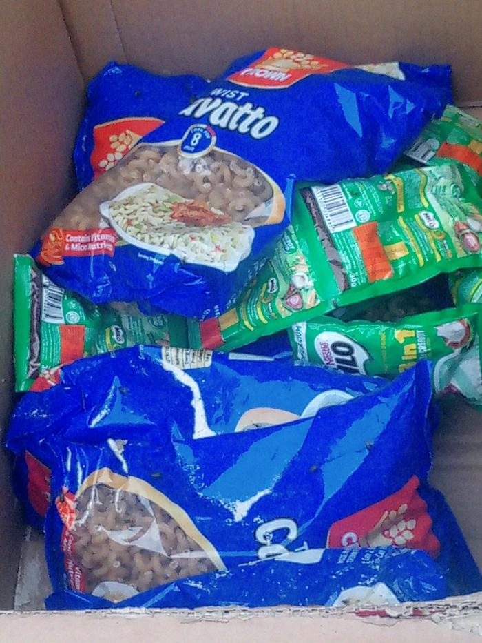 Within a brown corrugated cardboard box in Zango-ndaji, Nigeria, an assortment of packaged food items is densely packed