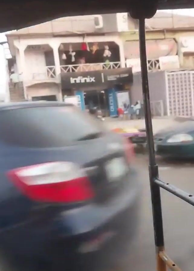 street scene filmed from inside a three-wheeled vehicle, likely an auto rickshaw or tuk-tuk
