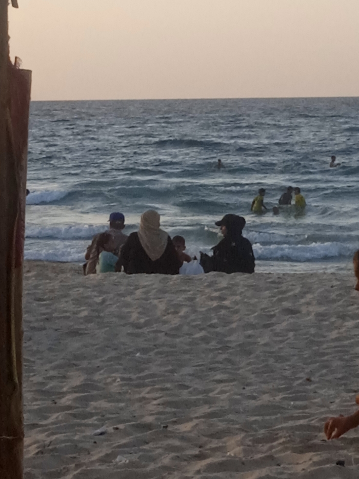 The image depicts a beach scene at dusk or late afternoon in Al-Mawasi, Palestinian Territories