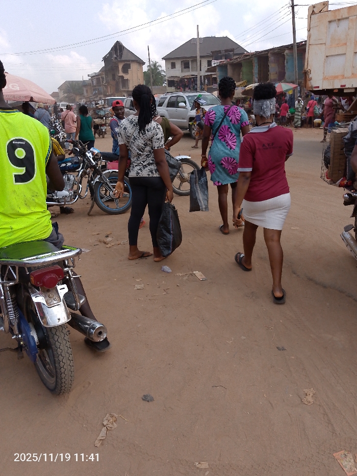 - "This image depicts a bustling street scene in Nnobi, Nigeria, on an unpaved, reddish-brown dirt road under an overcast sky, recorded at 11:41 on November 19, 2025" by FM-LzJlZ2, licensed under CC BY 4.0