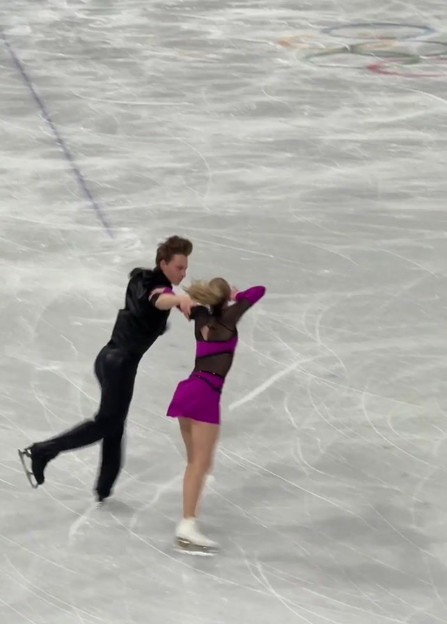 A pair of ice dancers, a man and a woman, perform on a white ice rink. The woman is wearing a purple dress with black accents, while the man is in black pants and a long-sleeved shirt. They glide around the rink holding hands, execute a lift, and twirl together. The backdrop features a banner for "Milano Cortina 2026" and the Olympic rings.