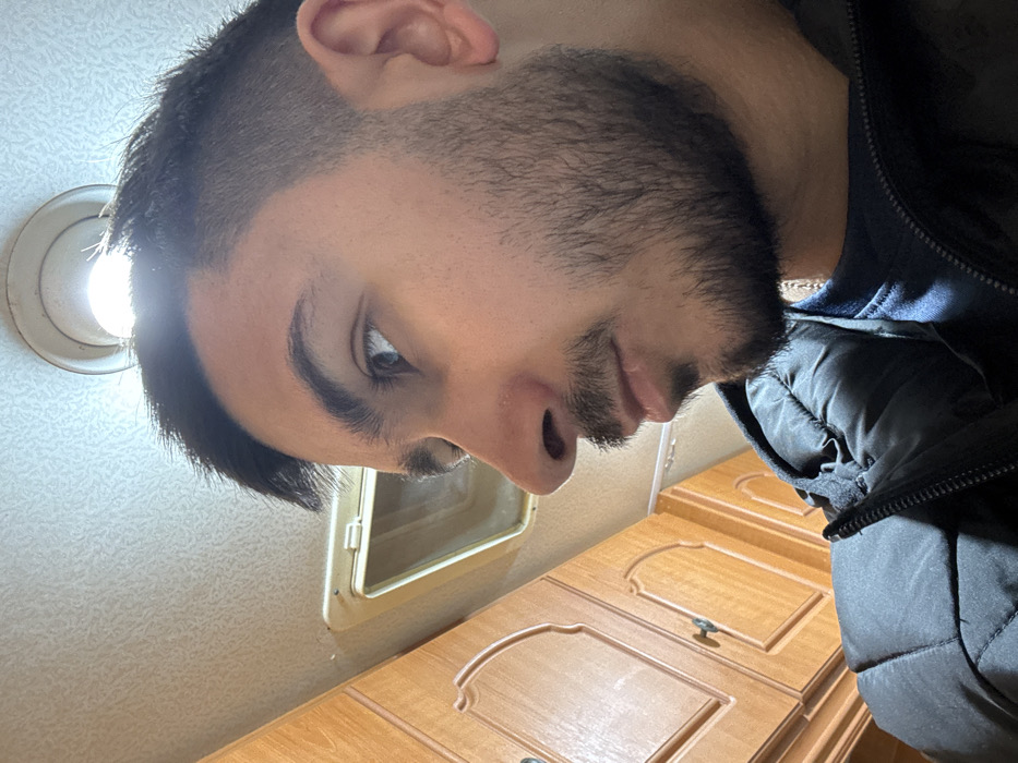 The image depicts an indoor scene, described as being located in Fowlis Easter, United Kingdom. The interior setting, characterized by a light-colored, textured ceiling, a circular dome light fixture, a small rectangular ceiling window or vent with a white frame, and light-brown wooden cabinets featuring arched decorative panels and dark circular knobs, is consistent with the living space of a recreational vehicle (RV) or caravan. A single male individual is prominently featured, visible from the mid-chest upwards, captured in profile facing towards the right side of the frame. He has light to medium skin tone, dark short hair with faded sides, and dark, well-defined eyebrows. His dark eyes are directed upwards and to the right. He possesses a prominent nose and dark facial hair, comprising a beard and mustache, which appear to be neatly trimmed. He wears a dark puffer jacket over a dark blue crew-neck shirt. No direct interaction with other subjects or objects is apparent; his action is solely one of observation upwards and to the right.