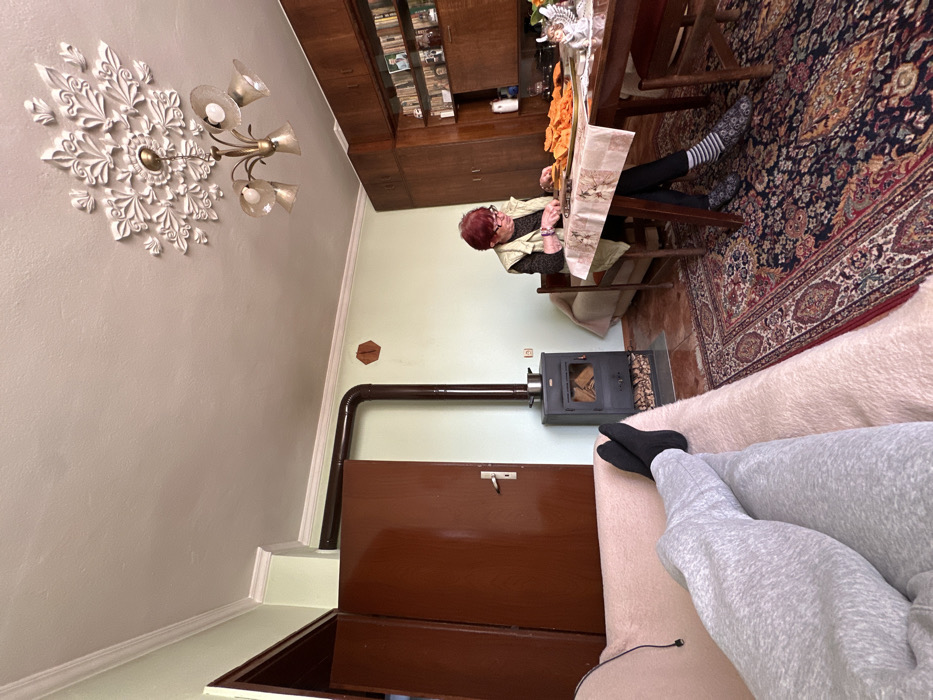 The image depicts an indoor domestic scene within a residence in the city of Aytos, Bulgaria. A light-skinned individual's legs, clad in light grey sweatpants and black socks, are extended onto a light pink textured sofa in the foreground. In the midground, an elderly woman with short, reddish hair, wearing a light-colored vest over a dark top and dark pants with striped socks, is seated at a wooden dining table. She is actively cutting orange-colored vegetable pieces, likely pumpkin or squash, which are spread on a tray in front of her. A large, ornate dark-patterned rug covers the floor in the center, transitioning to reddish-brown tiles near the left wall. A black wood-burning stove with a glass door, revealing burning logs, is situated against the light green wall on the left. A stainless steel pot rests on top of the stove. A dark brown stovepipe extends upwards, bends, and runs horizontally along the wall. A dark brown wooden door, partially open, is visible on the far left. The ceiling is white, featuring white crown molding and an ornate white ceiling medallion from which a brass-toned chandelier with four frosted glass shades hangs. A large dark brown wooden cabinet with multiple shelves containing various objects, including books, photographs, and decorative items, lines the right wall. A white angel figurine is visible on the dining table.