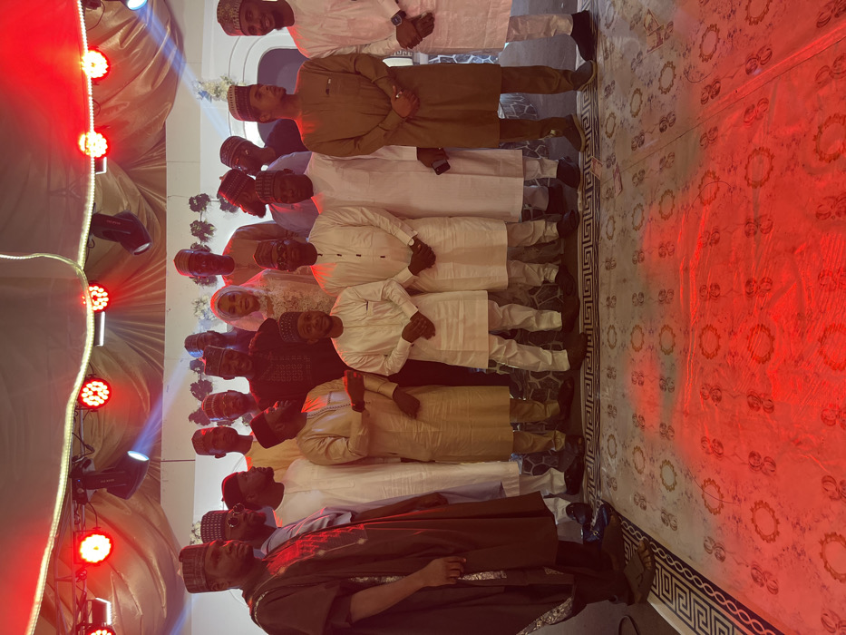A group of people stands in a line, mostly men, with a woman in white in the center. Most wear traditional attire and caps. The background shows wedding lights and decorations. The floor has a patterned design and is lit in red.