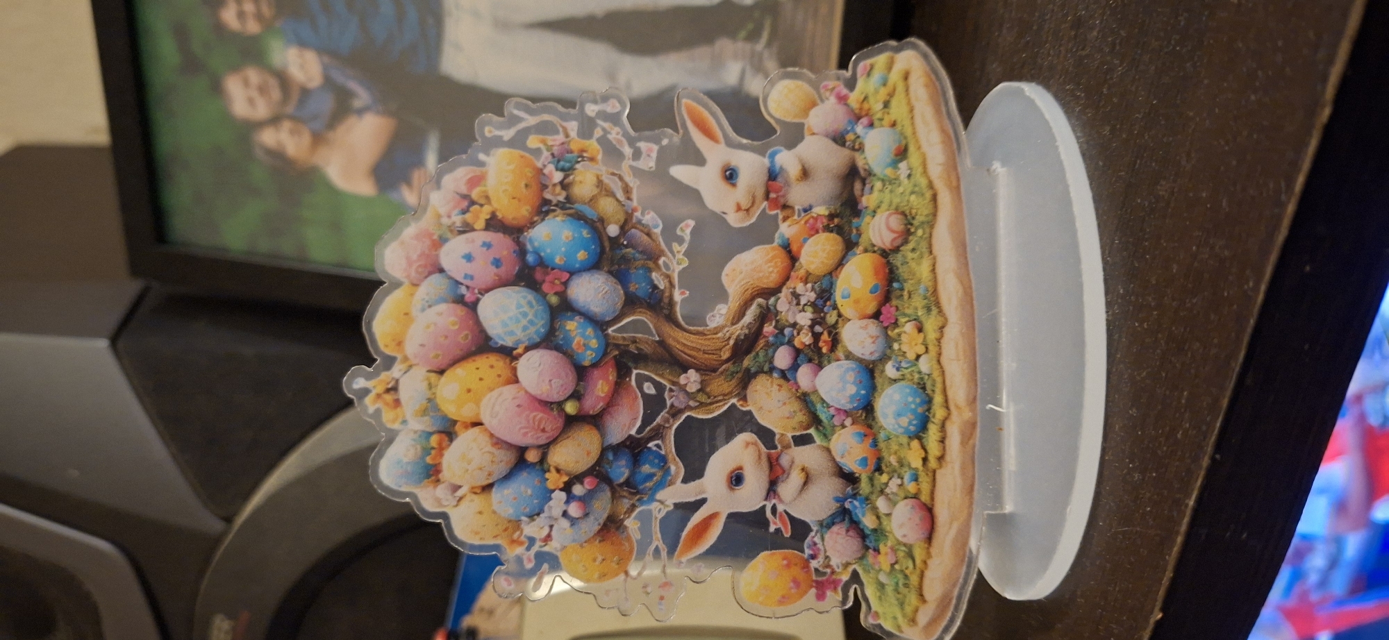 n Easter decoration featuring two rabbits amidst a tree of colorful Easter eggs and grass. The decoration is a clear acrylic cutout, standing on a clear acrylic base. The backdrop includes a framed photograph of a family, part of a stereo system, and a dark wooden surface. The location is not discernible from the image.