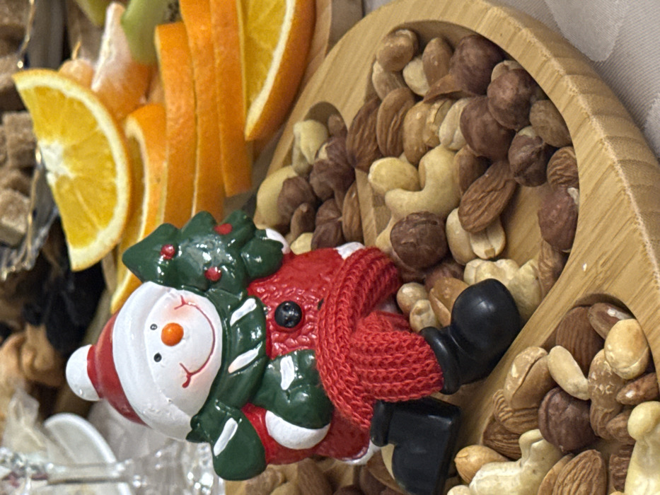A close-up shot displays a wooden serving tray divided into sections. One section contains orange slices, while another is filled with a mix of nuts including almonds, cashews, and hazelnuts. A decorative snowman figurine wearing a red suit, black boots, and carrying a green Christmas tree sits on the edge of the nut section, adding a festive touch.