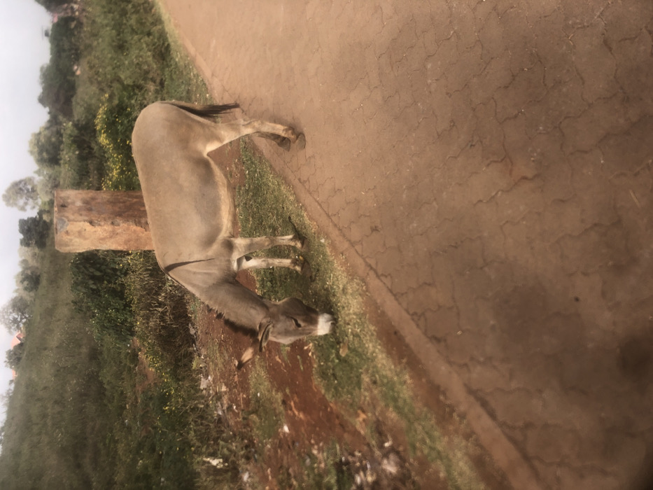 - "A light brown donkey with a dark dorsal stripe stands partially on a reddish-brown paved path and a grassy verge, actively grazing on green vegetation" by FM-mkEu63, licensed under CC BY 4.0