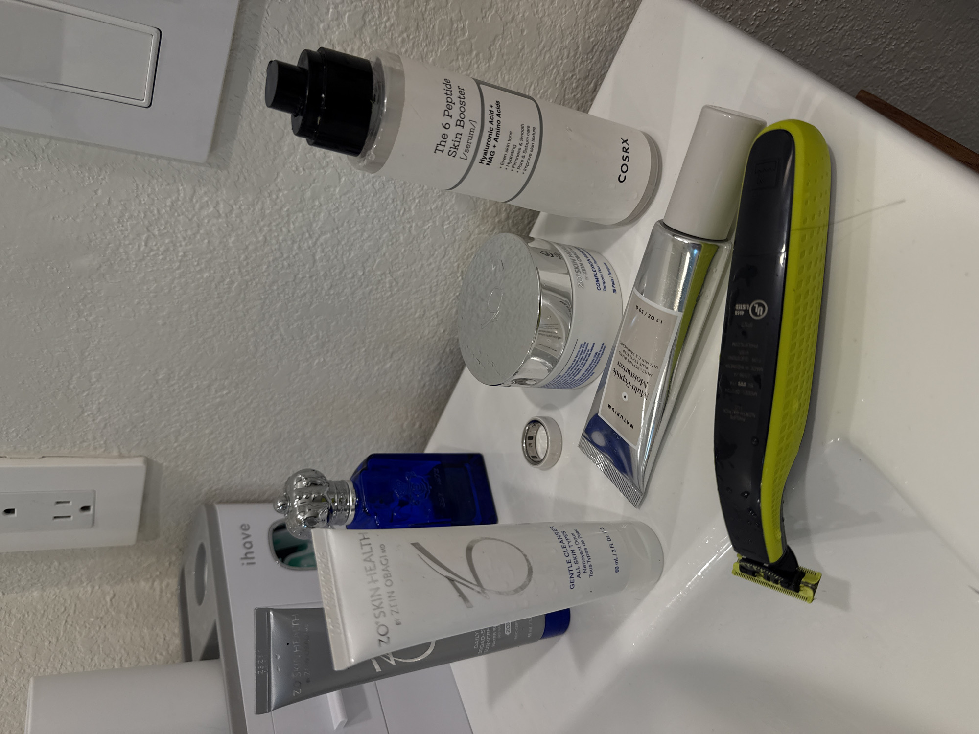 This is a photograph taken in a bathroom. The items visible are: a light switch, a two pronged outlet, a box with “ihave” printed on it, a bottle of cologne with a silver cap, a gray tube with “ZO SKIN HEALTH” printed on it, a white tube with “ZO SKIN HEALTH by ZEIN OBAGI MD GENTLE CLEANSER ALL SKIN TYPES” printed on it, a silver ring, a blue and white container, a tube of “NATURIUM Multi-Peptide Moisturizer” printed on it, a white bottle with “COSRX” printed on it, and a green electric razor. The location cannot be determined.