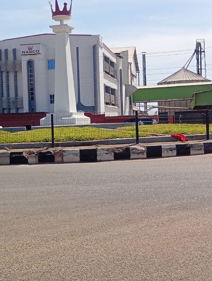 The image depicts an urban industrial scene in Jos, Nigeria, specifically featuring the NASCO headquarters and manufacturing complex