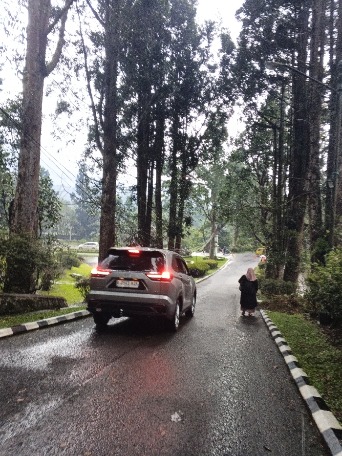 A gray SUV with lit tail lights drives on a wet asphalt road lined with tall trees on either side. A person wearing a dark hijab walks along the road's edge near the right side of the frame. The road has a black and white striped curb. Other cars are faintly visible in the distance, suggesting a park or recreational area. The lighting indicates an overcast day or early evening.
