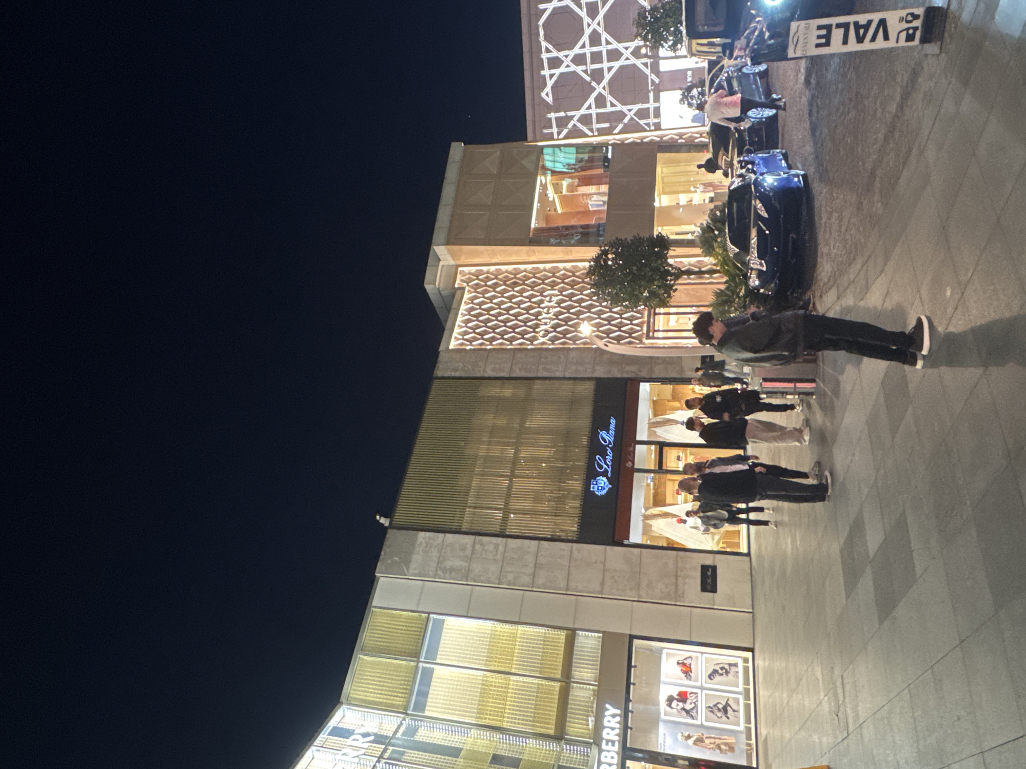 The image depicts a nighttime scene in Sarıyer, Turkey. Several luxury stores, including Loro Piana and Burberry, are visible. People are walking on the sidewalk in front of the stores. Cars are parked near a "VALE" sign. The buildings are illuminated, showcasing modern architectural designs. The sky is dark, contrasting with the bright lights of the stores and the surrounding area.