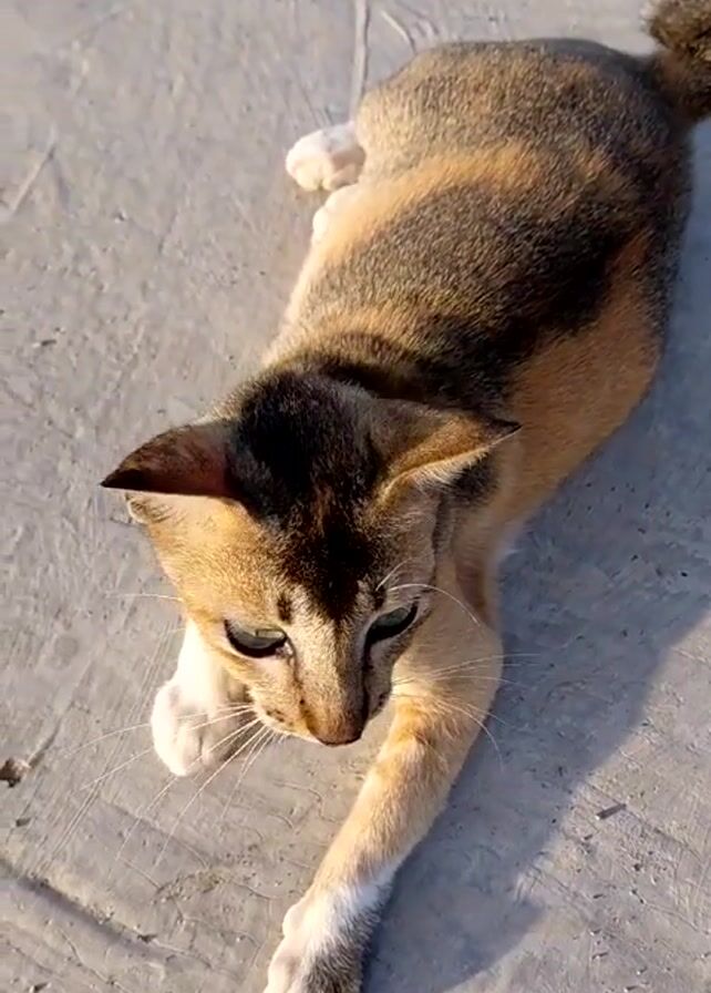 cat lying on a concrete surface. The cat has a mix of brown, tan, and black fur, with white paws and bright green eyes. The cat looks directly at the camera, stretches a front paw, and then turns onto its back, looking upwards. The camera angle is primarily from above, focusing on the cat's movements and expressions.