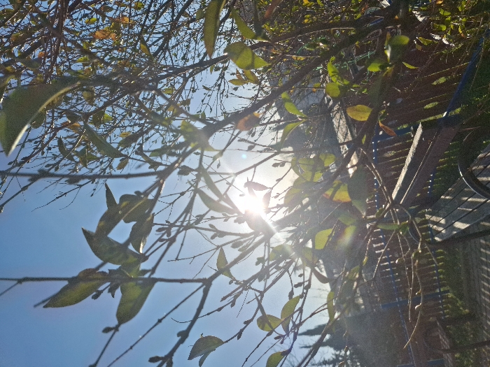 This image depicts an outdoor scene in Stara Zagora, Bulgaria, captured from a low perspective under bright sunlight. The upper two-thirds of the frame show a clear, light blue sky with the sun prominently positioned slightly left of center, generating significant lens flare and sunburst effects through the surrounding foliage. A dense network of tree branches, some bare and others sparsely populated with small green and yellowish-green leaves, dominates the foreground, silhouetted against the bright sky. In the lower third of the image, a dark wooden slatted bench is partially visible on the right, extending leftwards, casting distinct parallel shadows onto the ground. Behind the bench, a low fence constructed of vertical blue-painted wooden slats is present. Beyond the fence, blurred outlines of distant structures and taller trees or shrubs are visible in the background. No people are present. The scene is well-lit, indicative of a sunny day, likely in late autumn or early spring due to the mixed presence of bare branches and sparse foliage.