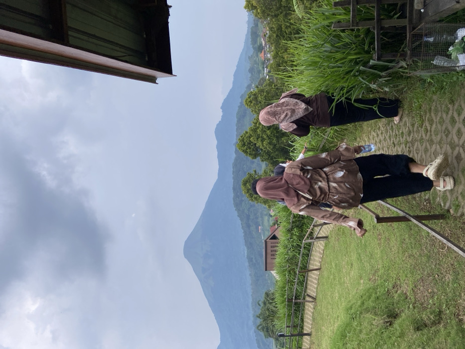 The image depicts an outdoor scenic view near Penanggungan, Indonesia, on an overcast day