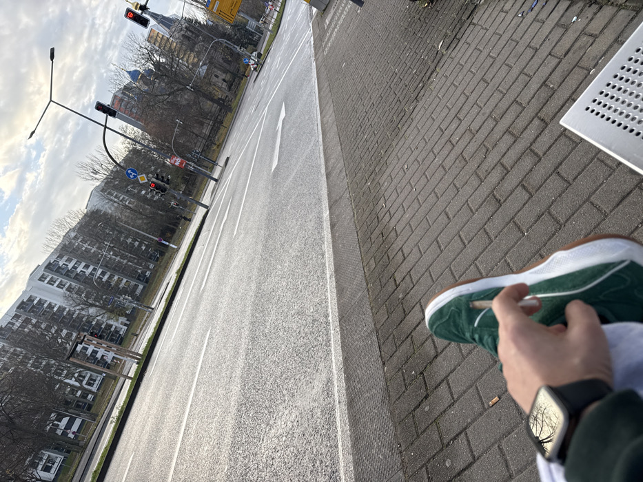An angled shot features a street with buildings and bare trees lining the left. Traffic lights are visible, some red. A sidewalk of grey bricks runs along the right. The edge of a perforated metal trash can is visible. In the foreground, a hand holds a green and white sneaker. The wrist wears a black smartwatch with a tree reflection on its face.