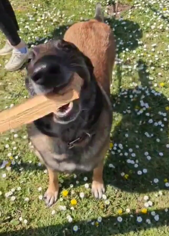 A brown and black dog stands in a grassy area with white and yellow flowers. The dog is holding a piece of wood in its mouth and looking directly at the camera. A person in black pants and white sneakers stands to the left of the dog. The dog wags its tail.