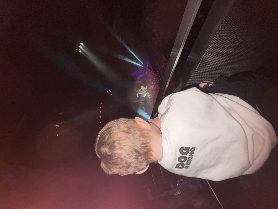 An image taken from an elevated perspective inside a dark arena or theater in an Unknown city, Russia, depicts the back of a young child observing a performance on a distant stage. The child, with short, light-colored hair, wears a light cream or off-white long-sleeved sweatshirt bearing the dark text "DOG RIDING" across the upper back. The child's right foot, partially visible, shows red and white footwear. The stage, brightly illuminated by multiple spotlights casting white, blue, and purple beams, is the focal point in the background. Several costumed figures, appearing small due to the distance, are present on the stage, along with a visible red ladder and scattered red material, possibly confetti. A row of red lights is positioned above the stage. The environment is dark, with spectator seating visible in the lower right, beyond a dark metal railing that features a perforated pattern on its lower section. The overall impression is that of a live indoor performance or event.