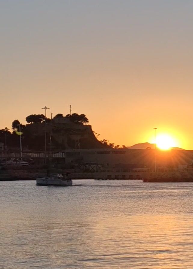 sunset over a body of water. The sun is a bright white-yellow disk partially obscured by a dark, silhouetted landmass with buildings and vegetation. A small, dark object resembling a boat or dock is visible near the shoreline. The water reflects the warm colors of the sunset, creating a shimmering effect. The sky is a gradient, transitioning from a light blue to orange near the horizon.