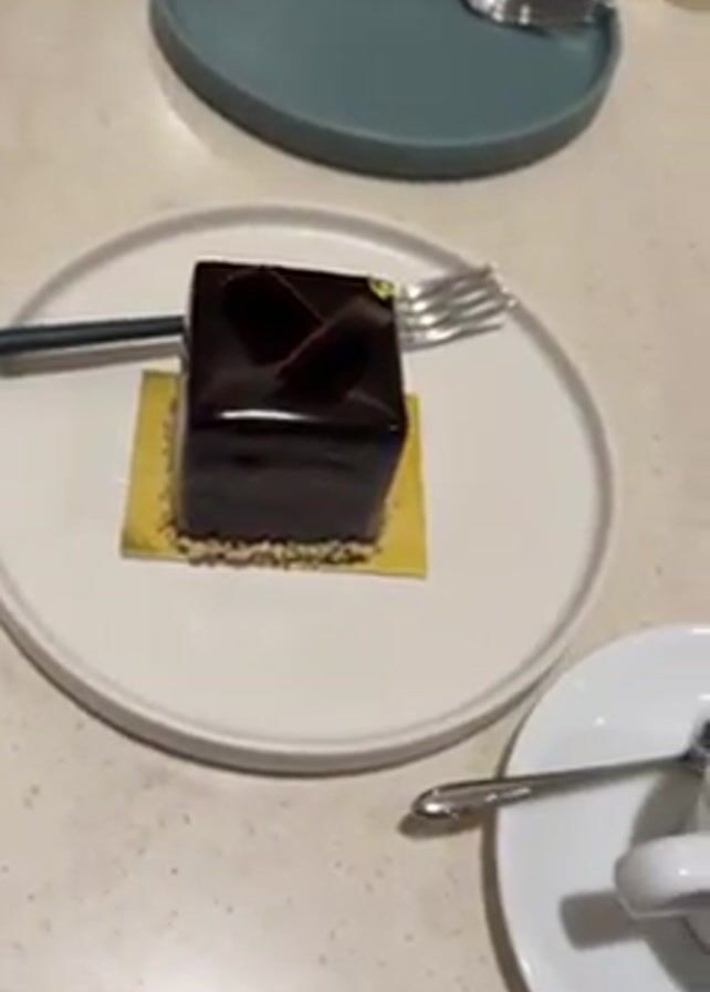 A top-down view shows a table with a square chocolate cake on a white plate, a fork, and a small white cup of coffee with a heart design in the foam. To the upper left, there is a small blue plate with a knife and fork on it. A cell phone is visible to the upper right of that blue plate. The table is a light speckled color. The camera circles slightly.