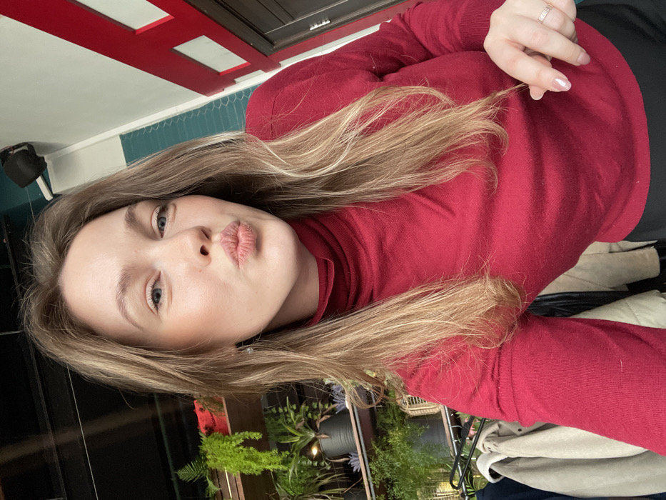 A female individual, estimated to be in her 20s to early 30s, is captured in a medium close-up selfie, looking directly at the camera with her lips pursed in a pouting expression