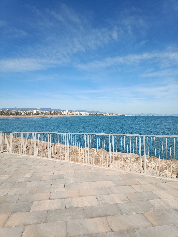 The image displays a coastal scene within the municipality of Sagunto, Spain, likely along one of its beachfront promenades such as those in Puerto de Sagunto. The foreground features a paved walkway constructed from rectangular light-colored tiles, extending from the bottom of the frame. A light gray metal railing, composed of horizontal rails and vertical posts, runs diagonally from the lower left to the right side of the image, acting as a barrier. Beyond the railing, a rocky embankment forms the immediate shoreline. The midground is dominated by a calm, turquoise-blue sea, exhibiting minimal surface disturbance. Along the distant horizon, a line of multi-story buildings and structures typical of a developed coastal town stretches across, backed by faint, undulating mountain ranges. The upper portion of the frame is filled with a clear, light blue sky featuring scattered, wispy white clouds. No individuals, vehicles, or specific activities are present. The scene is illuminated by direct sunlight.