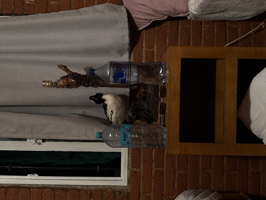window with a gray curtain partially covering it. A white porcelain duck figurine sits near the curtain, between two plastic water bottles. A branch of wood is placed behind the duck, and a pair of sunglasses leans against a wooden cabinet that is next to the duck. Brick wall can be seen in the background.