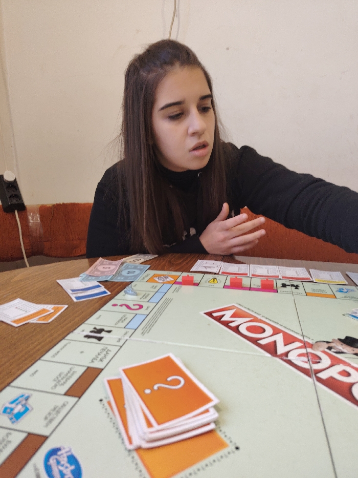 An indoor scene, possibly in Izvor, Bulgaria, depicts a young female engaged in a game of Monopoly