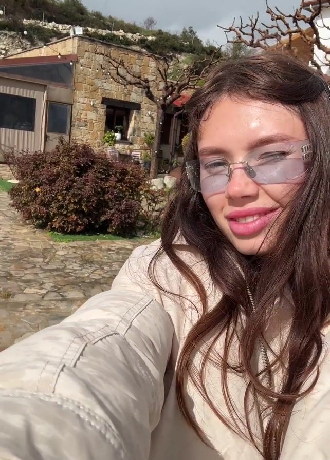 A young woman with long brown hair and light blue sunglasses is recording a video of herself outdoors. She is wearing a beige bomber jacket. She smiles and looks directly at the camera. Behind her is a stone-paved area with a building constructed of the same material and some greenery, suggesting a rural or countryside setting. The camera pans slightly, revealing a vineyard in the background, with rows of vines stretching across the landscape, and hills partially obscured by clouds.