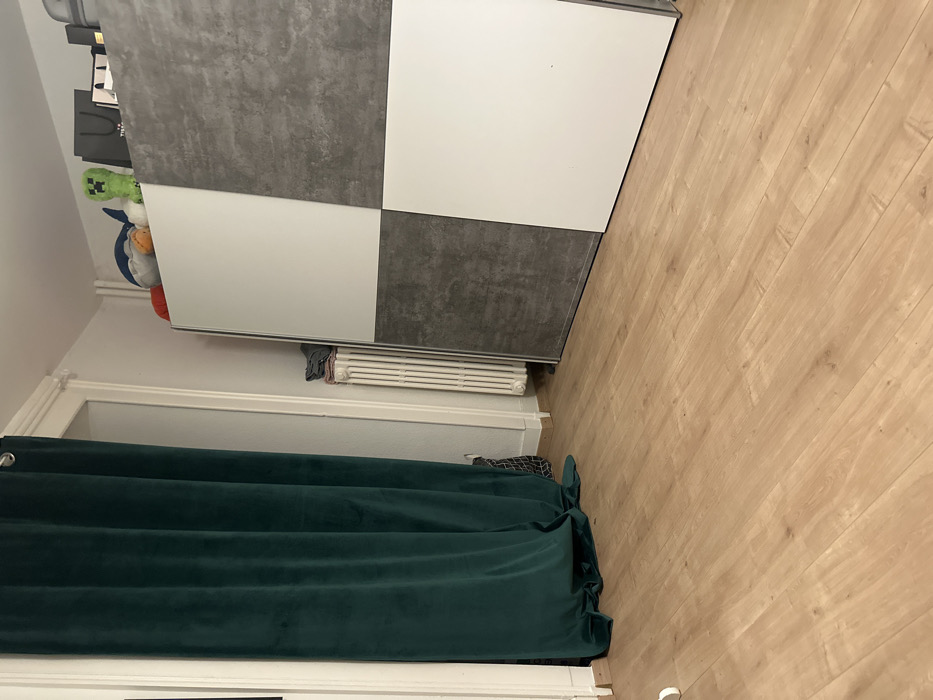 This interior photograph depicts a static scene within a room located in Montreux, Switzerland. The foreground is comprised of light wood laminate flooring. On the left, a dark emerald green velvet curtain with visible silver grommets hangs from a rod, obscuring a doorway or alcove, with its lower portion resting on the floor. A white doorframe is visible surrounding the curtain. To the right of the curtain, against a white wall, stands a white vertical panel radiator. A stack of folded gray fabric is positioned on top of the radiator. The right side of the frame is occupied by a large wardrobe or cabinet featuring four distinct panels: the top left and bottom right panels are white, while the top right and bottom left panels display a dark gray concrete-like texture. The top surface of this unit supports several objects, including a blue and white plush toy, an orange plush toy, a green pixelated plush toy, and multiple dark-colored paper shopping bags. No individuals are present within the frame, and no actions or interactions are occurring.