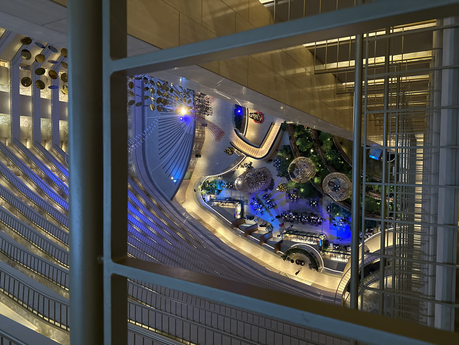 The image presents a high-angle, top-down view into the multi-story atrium of the Parkroyal Collection Pickering hotel in Singapore, Singapore. The foreground is occupied by a light-colored metal railing, framing the downward perspective. The atrium features numerous tiered levels of balconies or walkways lining both sides, characterized by repeating horizontal architectural lines. These upper levels are illuminated by a combination of warm yellow and cool blue artificial lighting, creating a striped visual effect. The expansive ground floor of the atrium serves as a communal space. It incorporates lush, multi-level indoor gardens with dense green foliage, interspersed with large, spherical, woven light fixtures. Multiple seating areas with tables and chairs are arranged throughout these garden spaces, occupied by numerous individuals engaged in social interactions or dining. A prominent, large golden sculpture composed of numerous flat, suspended discs is visible towards the upper right section of the central ground floor. Another large, organic, pod-shaped structure, possibly a seating or decorative element, is situated within one of the garden areas. Curved walkways and pathways connect different sections of the ground floor. Towards the back, a large curved floor area displays a radial pattern emanating from a central point, illuminated by a bright light source. Discrete red and white decorative objects are visible near a curved staircase, suggesting holiday or event décor. The entire scene is illuminated by artificial lighting, indicating an evening or nighttime setting.