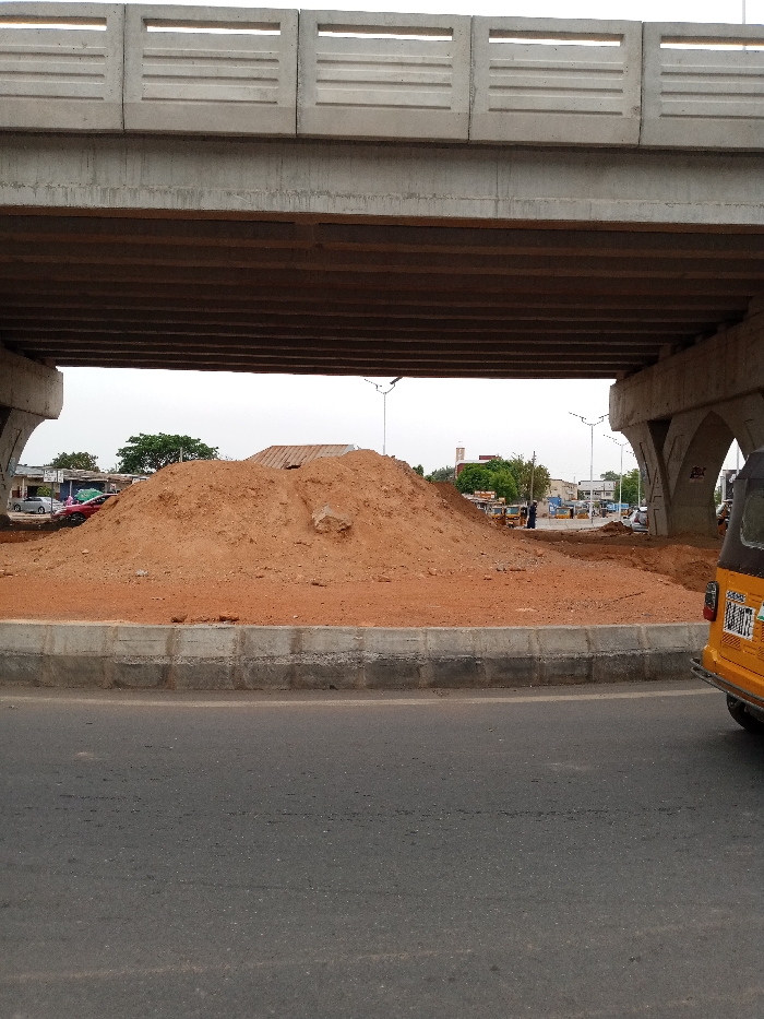 large pile of dirt in the middle of a roundabout. The dirt pile is in front of a concrete bridge, which is located at the intersection of major roads. The roundabout is being constructed and there is a yellow three-wheeled vehicle parked on the right-hand side. There are several street lights and trees surrounding the roundabout. The location is 9.279° N, 12.451° E, which is in Yola, Nigeria.