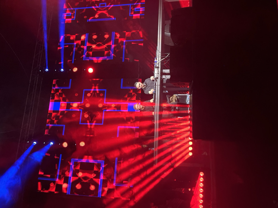 A concert stage is illuminated with red and blue lights, shining on a backdrop featuring a geometric pattern. Two people are visible on a platform, with one appearing to be a DJ using equipment. Light beams emanate outwards, adding to the dramatic visual effect. The overall ambiance suggests a vibrant and energetic live music performance.