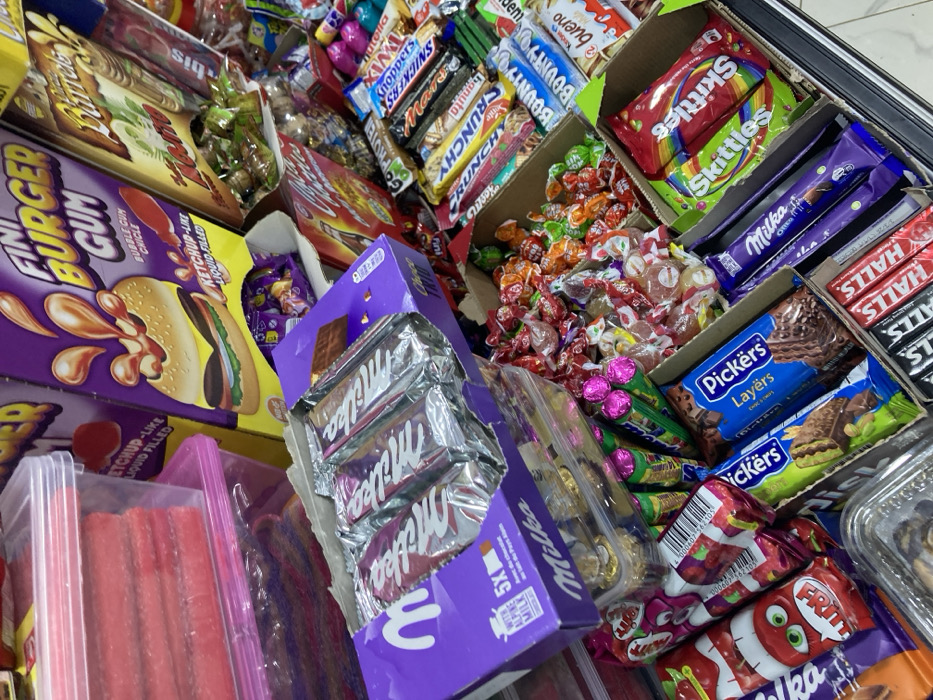 An eye-level shot captures a vibrant assortment of candies and chocolates