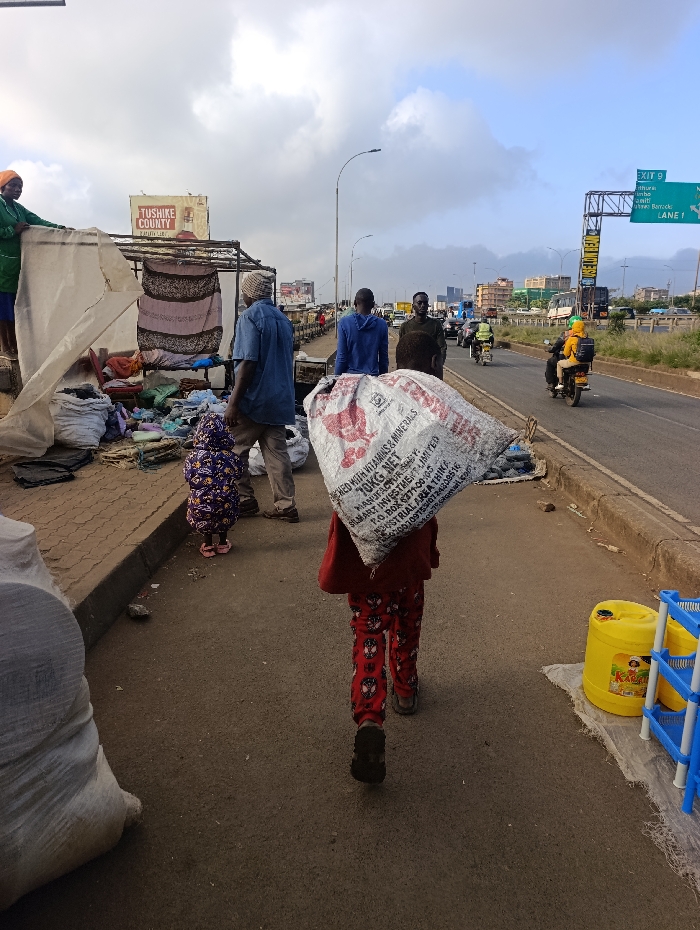 A child carries a large bag on their back along a roadside path. Several adults are nearby, and a smaller child stands next to an older man. A roadside stall with fabric and other goods is visible in the background. The setting is urban, with a highway running alongside the path, indicated by a road sign. The sky is overcast with clouds. A billboard advertises "Tushiike County" in the distance. A yellow container and a blue plastic shelf are next to the child.