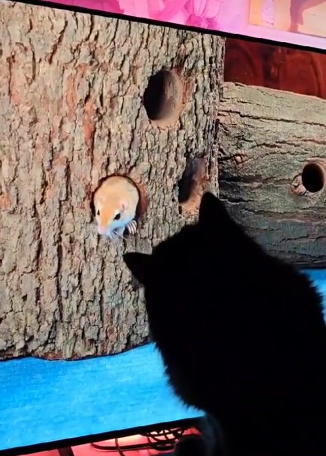 A black cat is standing in front of a large television screen, observing an image of logs with holes in them. In the video, a mouse emerges from one of the holes, runs across the screen, and then reappears from another hole. The cat's silhouette is clearly visible as it watches the screen. The background includes a desk with a blue surface and images hanging above the television.