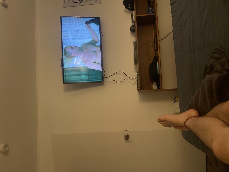 A person is lying in bed with bare feet and a red anklet visible. A television mounted on the wall is playing a scene of a shirtless man. A wooden shelf with items inside hangs near the bed. A white door with a silver doorknob is partially visible. The room has neutral-colored walls.