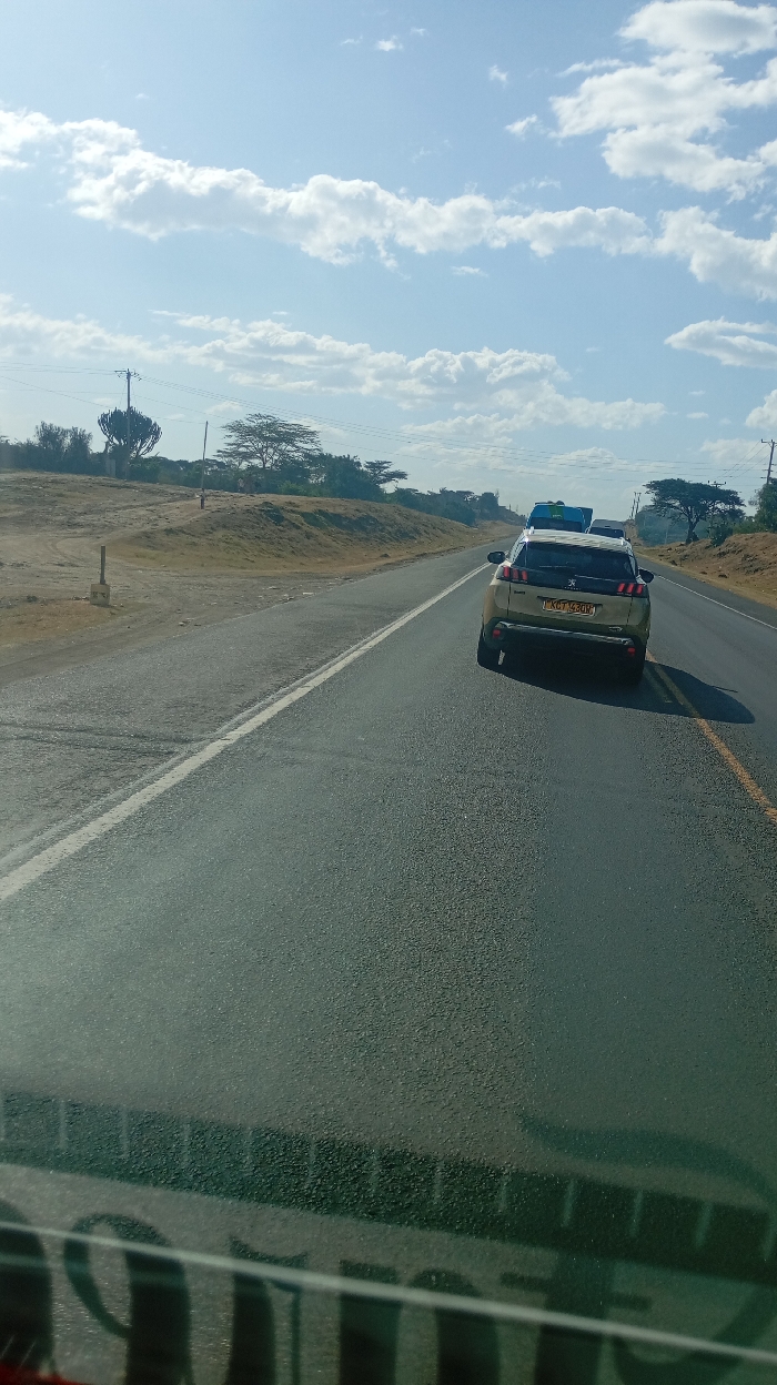 A car is seen from behind on a smooth asphalt road, appearing to be in motion. The sky is blue with scattered clouds. The landscape on either side of the road is dry and grassy with sparse trees and bushes. A utility pole stands to the left. The view is partially obstructed by the vehicle's windshield, which shows reflections of lettering or graphics inside the vehicle. The license plate on the car is partially visible.