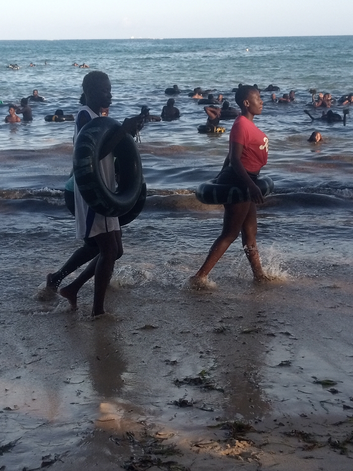 This image captures a beach scene in Shanzu ward, Kenya, featuring multiple individuals in and near the ocean