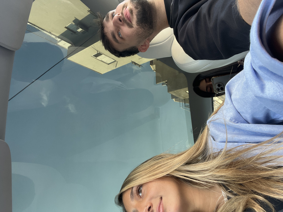 The image captures the interior of a vehicle, likely a Tesla, traveling in Bnei Brak, Israel. The perspective is directed upward through a panoramic glass roof, which reflects a clear blue sky with scattered clouds and elements of an urban environment: light-colored, multi-story buildings with balconies, and overhead utility lines. Three individuals are visible within the vehicle. In the left foreground, a young female with long blonde hair, wearing a light blue collared shirt, is shown from the chest up, looking upward and to the right. She has a small nose piercing. To her right and slightly behind, a young male with short dark hair and a beard, wearing a black shirt and a silver chain necklace, is also visible from the chest up, looking upward. Between these two, in the mid-background, a third person with dark hair is partially visible, holding a smartphone (consistent with an iPhone model) in front of their face. The vehicle's interior features a white seat visible on the right.