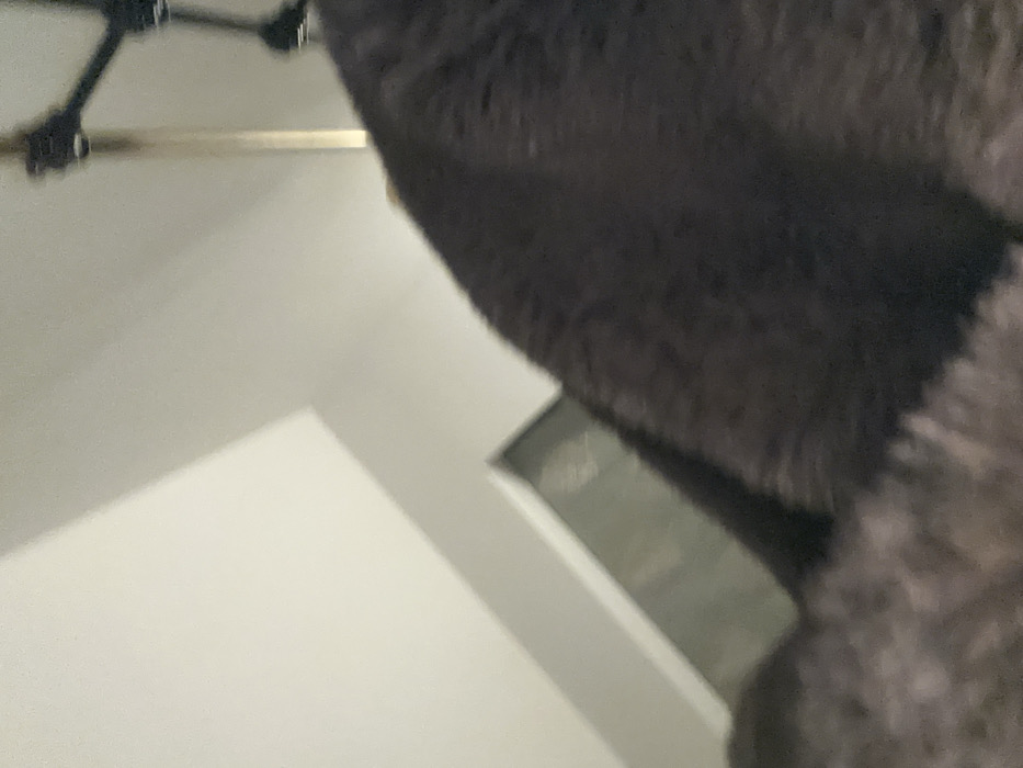 The image displays an indistinct interior scene, heavily out of focus. The foreground and lower-right area are occupied by a large, dark, textured mass, appearing as a dark gray or black furry material, consistent with an animal's fur or a plush fabric. In the background, light-colored architectural surfaces, likely walls and a ceiling, are visible, intersecting at a distinct diagonal line, indicating an internal corner or a sloped ceiling. Towards the upper right, a thin, vertical, light-toned support structure, potentially a metallic pole, extends upwards, accompanied by a darker, multi-jointed apparatus, suggestive of a lamp or camera stand. A dark, rectangular object is vaguely discernible against a lighter wall surface in the lower-left background. No individuals are visible. The specific location within Wealden, United Kingdom, cannot be determined from the provided visual information.