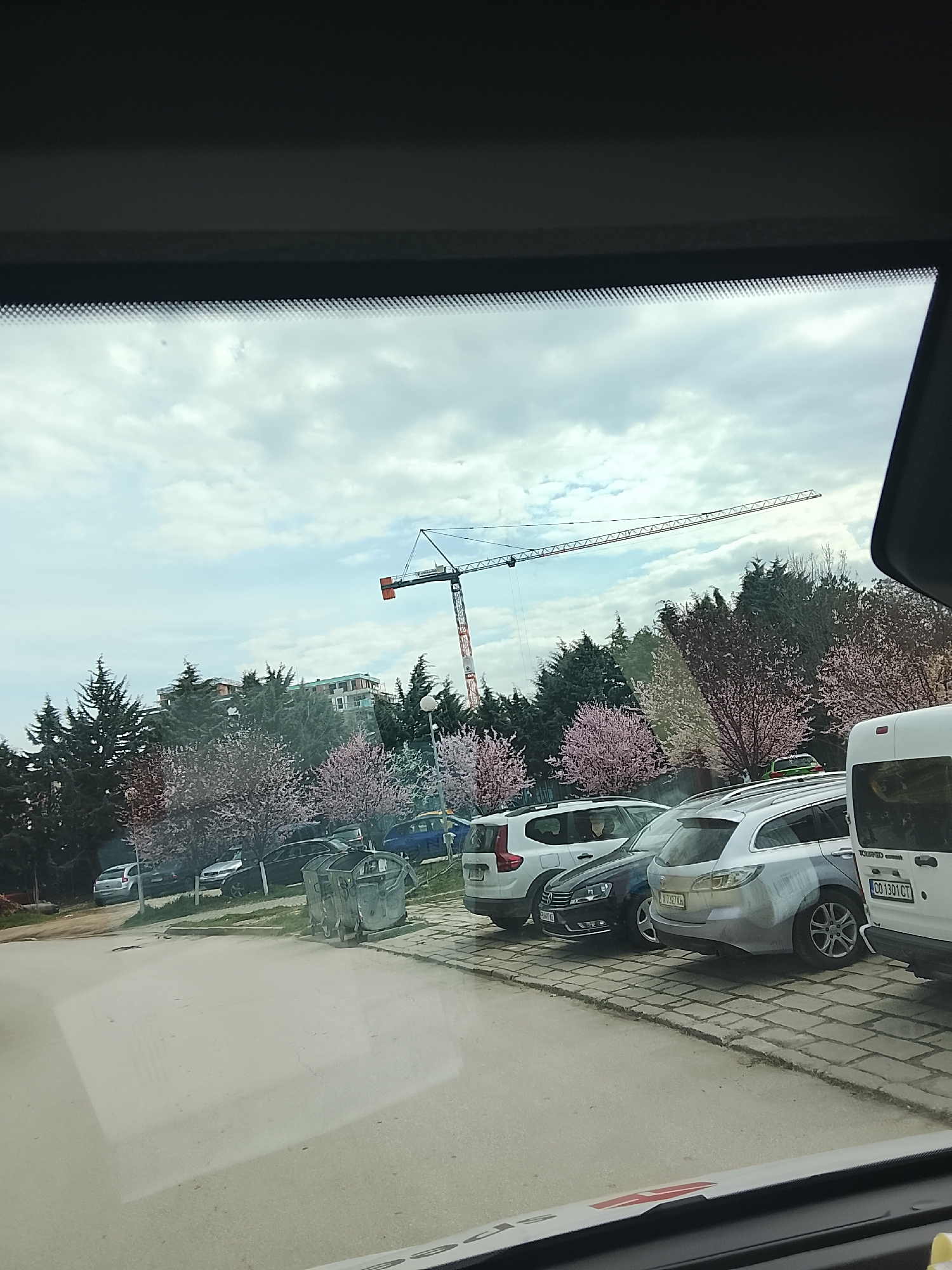 The image depicts an outdoor scene in the city of Plovdiv, Bulgaria, viewed from within a vehicle through its windshield. The top portion of the frame shows the vehicle's interior roof lining and the upper edge of the windshield with a black frit band. The sky above is largely overcast with multiple grey clouds, interspersed with patches of lighter sky. In the immediate foreground, a light-grey paved surface, likely asphalt, occupies the lower left. This transitions to a section of light-colored, rectangular stone paving on the right, which borders a line of parked vehicles. Two metallic-grey, lidded waste bins are positioned on the stone paving, approximately centered in the lower midground. A series of automobiles are parked parallel to the paved path. From the left, a white Volvo SUV is partially visible, displaying a Bulgarian Plovdiv region license plate `P 0379 KT`. Adjacent to it is a dark sedan, identified as a Volkswagen Passat, bearing a Bulgarian Varna region license plate `V 737 KH`. Next is a silver station wagon, and on the far right, partially visible, is the rear of a white commercial van with a Bulgarian Sofia region license plate `CO 1301 CT`. Other vehicles, including a blue sedan and a green car, are indistinctly visible further back. Behind the parked vehicles and along the upper midground, dense vegetation is present, consisting of dark green coniferous trees and numerous deciduous trees bearing pink and white blossoms, suggesting springtime conditions. Rising above the tree line and visible in the background are multiple multi-story buildings, some appearing to be recently constructed or under active development with exposed concrete elements. A large, prominent red and white tower crane, associated with construction, extends its boom across the sky from the left midground towards the right, signifying ongoing building activity. No individuals are visible within the frame, and no specific actions or interactions are occurring.