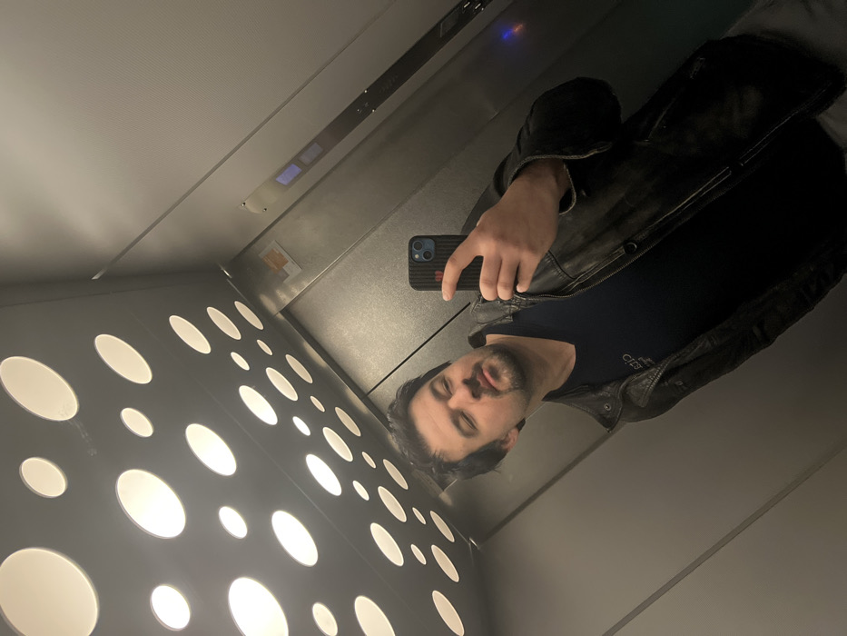 Inside an elevator car in the city of Unknown, Unknown, a male subject is taking a mirror selfie