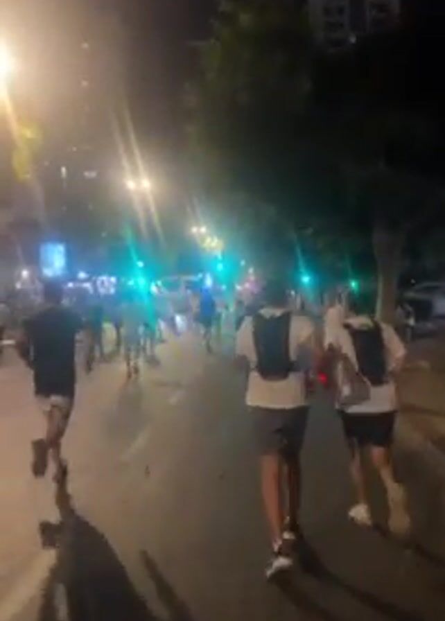 group of people running on a paved road at night. Streetlights and traffic signals illuminate the scene. Many of the runners are wearing dark clothing and backpacks. A tall building is visible in the background, along with trees and other street infrastructure. The camera follows the runners from behind as they move forward.