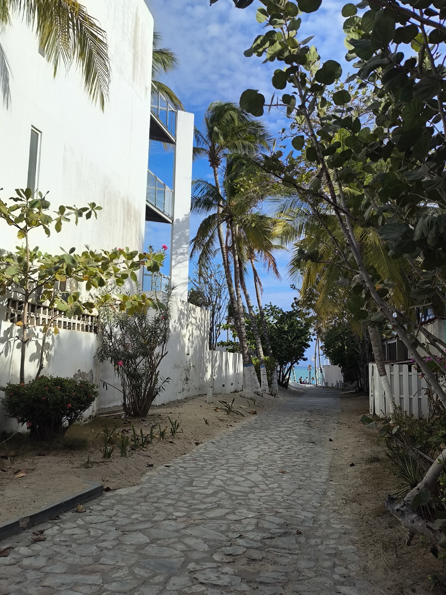 This photograph, taken in El Yaque, Venezuela, depicts a cobblestone path leading towards the ocean. The path is flanked by white buildings and fences on either side, with various trees and plants adding a tropical feel. Palm trees are visible in the background against a partly cloudy blue sky. At the end of the path, a beach scene is visible where several people are sitting or standing near the water. The vegetation on the right side of the path includes trees with broad leaves, while the left side features a building with balconies and a mix of bushes and smaller trees. The light suggests it is daytime.