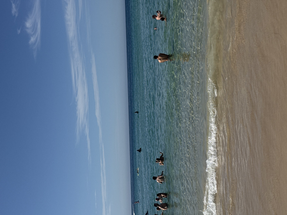 A beach scene features a clear blue sky with faint clouds. A line of people are swimming in the ocean near the shore. The water is clear and reflects the sky. A sandy beach extends to the right, marked by white waves rolling in. The scene is captured from a high angle, lending a broad perspective to the tranquil coastal setting.