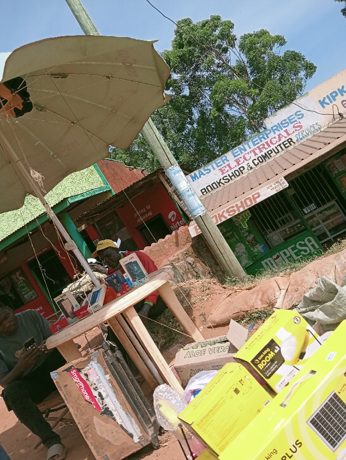 An outdoor scene in Ngenyilel ward, Kenya, depicts a commercial street or market area under a clear sky. In the foreground, two males are present. On the left, a male in a grey t-shirt and dark pants sits, focused on a smartphone. To his right and slightly behind, another male wearing a red shirt and a yellow cap sits behind a light-colored wooden table. This table displays multiple small boxes, likely containing mobile phones, some branded "MIRA A10." Below the table, a wooden board with "Smartphone" text and a tripod-like object are visible. An open, light-colored umbrella provides shade over the table area. To the immediate right, several yellow cardboard boxes are stacked, one clearly marked "sun king BOOM" and another "sun king PLUS," indicating solar-powered products. The background features single-story commercial buildings with corrugated metal roofs. A prominent sign on one building reads "MASTER ENTERPRISES," "ELECTRICALS," "BOOKSHOP & COMPUTER SERVICES," and partially "KIPK..." Below this, another sign mentions "ICE COLD WATER SODA." A shop further right displays "M-PESA" branding on a green sign. To the left, another building shows an "Airtel" logo. A utility pole, wrapped with blue and white material, stands in the center. The ground is dirt, and lush green trees are visible against the sky in the upper background.