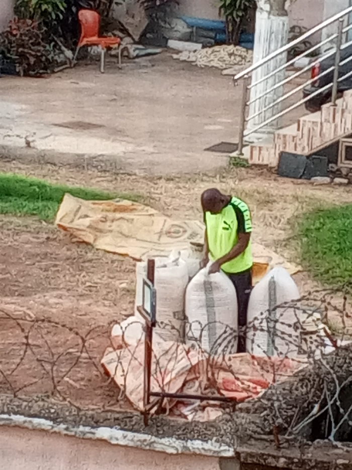 An outdoor scene in Sabon Tasha, Nigeria, depicts an adult male engaged with multiple large sacks