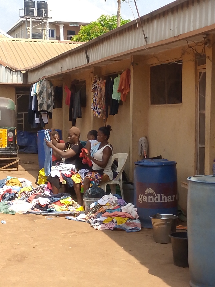 This image depicts an outdoor scene in Ukwu-Abwa, Nigeria, under bright daylight conditions. The foreground consists of an unpaved, reddish-brown dirt ground. On the right, a single-story building with a light tan stucco-like exterior runs horizontally across the frame. It features two rectangular windows with dark screens and a corrugated metal awning extending from its facade. Clothes of various colors and patterns are hung from lines beneath this awning. A white mop head hangs on the building's wall to the right. Two adult females and two children are seated in the central-right portion of the frame. The woman on the left, wearing a dark top and patterned shorts with a light head covering, holds up a light blue garment. She is seated amidst a large pile of colorful clothing spread on the ground. The woman on the right, wearing a white sleeveless top and patterned shorts, sits on a white plastic chair, holding a small child wearing a light blue garment and a red piece of clothing. Another large pile of colorful clothes is positioned in front of her. To the right, a large blue plastic barrel with the word "gandhar" printed in white and orange is visible, next to several metal and black plastic buckets. A second, partially visible grey-blue barrel is further to the right. On the far left, the rear section of a yellow and black three-wheeled vehicle, possibly an auto-rickshaw, is present. In the background, another building with a corrugated metal roof is visible to the left, and a taller structure topped with three black water tanks on a metal stand is seen against a partly cloudy sky. Green foliage from trees is visible in the upper background.