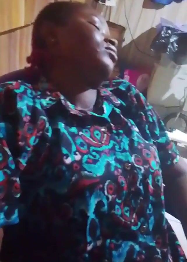 A woman with dark hair and skin wearing a blue, red, and black patterned shirt is sitting in a chair, looking upwards with her eyes closed. The background shows a room with wooden walls, a blue garment hanging on the wall, some electronic equipment, boxes, and a white cart.